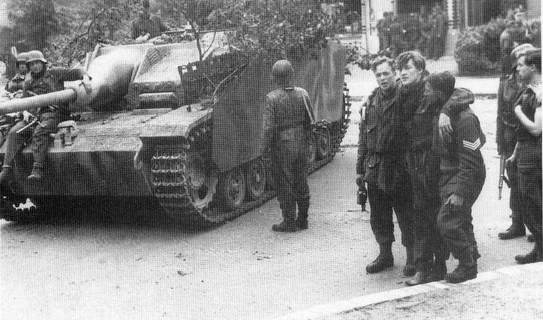 Paracaidistas Británicos de la 1 División Aereotransportada, capturados en Arnhem en Septiembre de 1944, observan los movimientos de un Stug III.