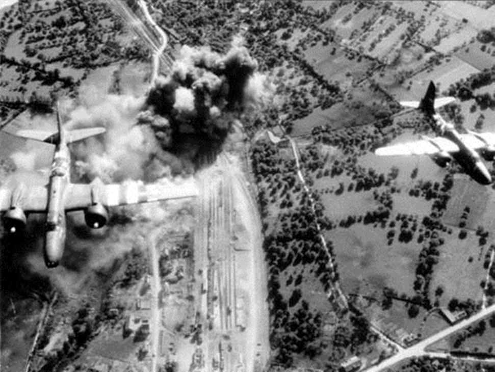 Douglas A-20 Havocs capturados por la cámara tras lanzar su mortal carga contra un nudo ferroviario.