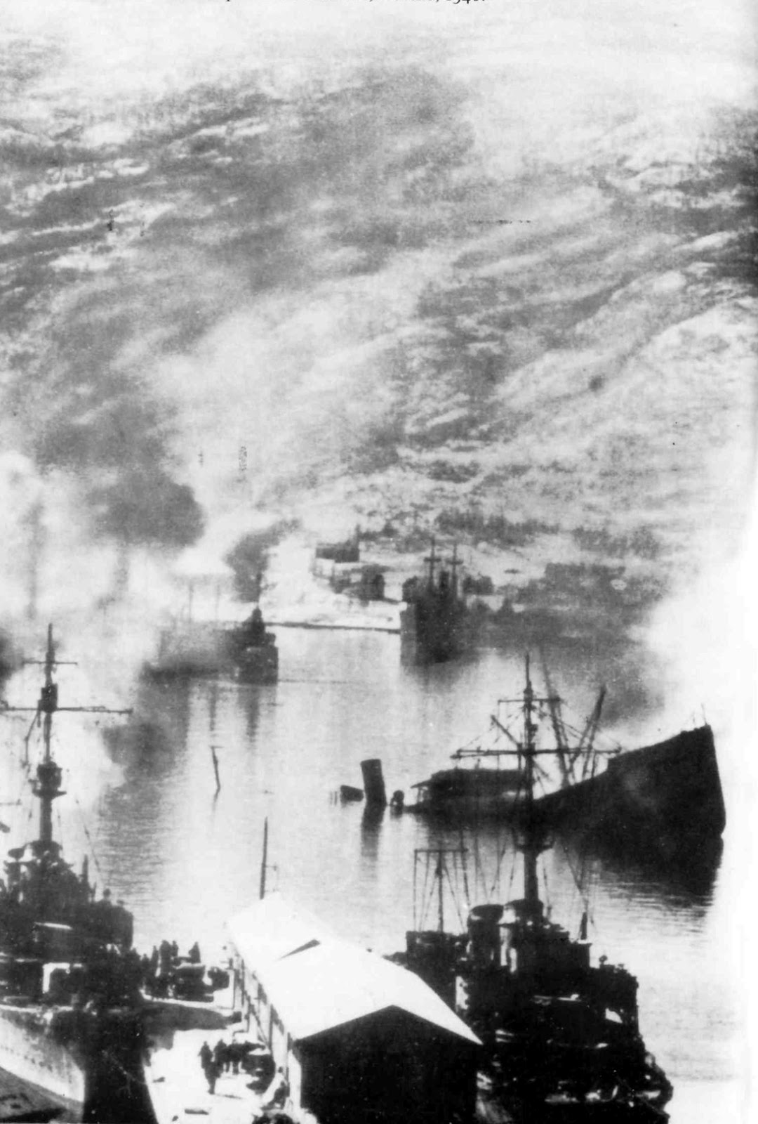 Buques Alemanes arden en el puerto de Narvik, Noruega, tras la visita de la flota Británica, en Abril de 1940.