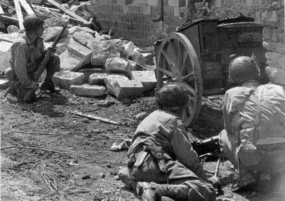 Paracaidistas Norteamericanos de la 101 División Aerotransportada entre las ruinas de Carentan en Junio de 1944.