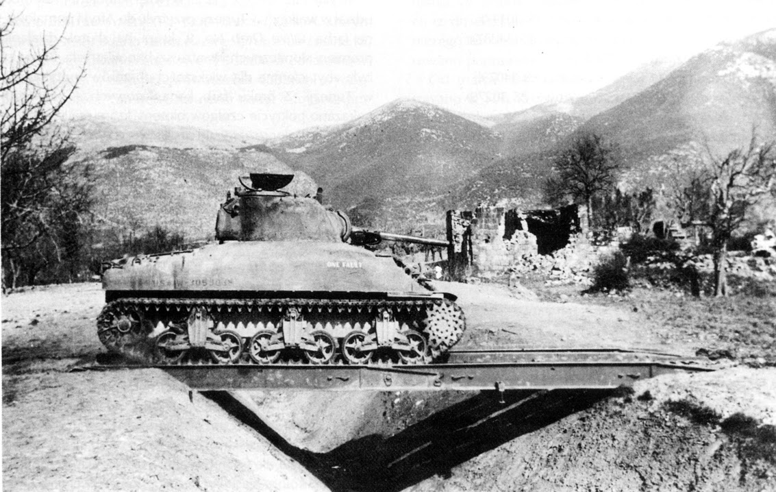 Un M4A1 Sherman cruza un pontón bajo los Montes Apeninos en Mayo de 1944.